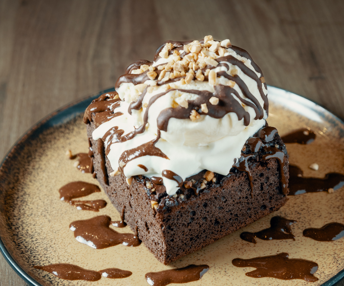 Tarta de chocolate + crema batida + mokambotella (nutella saludable) + helado de vainilla + garrapiñada de almendra